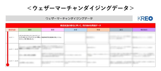 日本気象協会の協力のもと、KREOの自主調査「季節行動調査」と気象データの解析を行い、その週が例年よりも暑く・寒くなった際の、季節行動への影響度合いの把握が可能となりました。これにより、気温の変化にどの程度注視する必要があるのかを明らかにし、急な気温変化や今後の気温予測に対する発注・売場管理に貢献いたします。