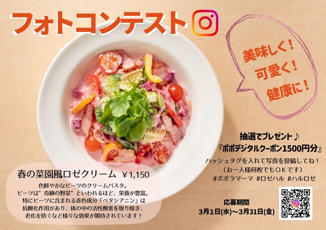 #ポポラマーマ #ハルロゼ #ロゼハル のハッシュタグを付けて、インスタグラムに写真を投稿するだけ。コンテスト期間は、3月1日~31日までの一か月間。(お1人様何枚でもOK)