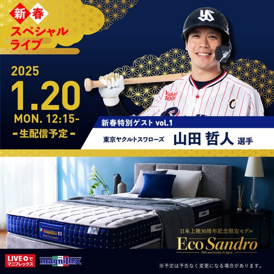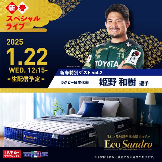 イタリアの総合寝具ブランド「マニフレックス」(輸入元:株式会社フラグスポート、代表取締役社長:山根崇裕、東京都港区)が提供するライブ配信コンテンツ「LIVEでマニフレックス」にて、2025年1月、新春スペシャルを放映いたします。