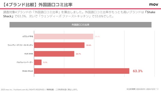 こちらのグラフでは、調査対象4ブランドの口コミにおける「外国語口コミ比率」を算出しています。外国語口コミ比率がもっとも高いブランドは「Shake Shack」で63.3%、次いで「ウェンディーズ・ファーストキッチン」で33.6%でした。