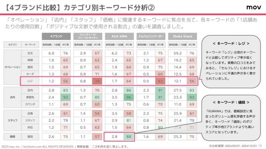 こちらの表では、「オペレーション」「店内」「スタッフ」「価格」に関連するキーワードに焦点を当て、各キーワードの「1店舗あたりの使用回数」「ポジティブな文脈で使用される割合」の違いを調査しています。