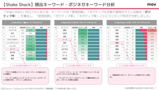 こちらの表では、「Shake Shack」の口コミにおけるキーワードの「使用回数」「ポジティブな文脈で使用されている割合(ポジティブ率)」を算出し、「使用回数」「ポジティブ率」「ネガティブ率」ごとにランキング形式で分析しています。