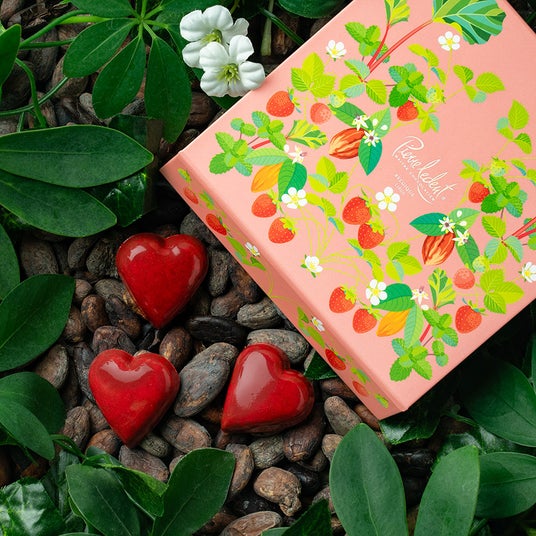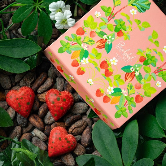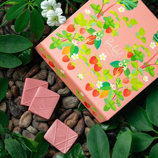 ホワイトとビターが絶妙に絡み合い、ストロベリーの酸味と芳しいヘーゼルナッツプラリネのハーモニー。