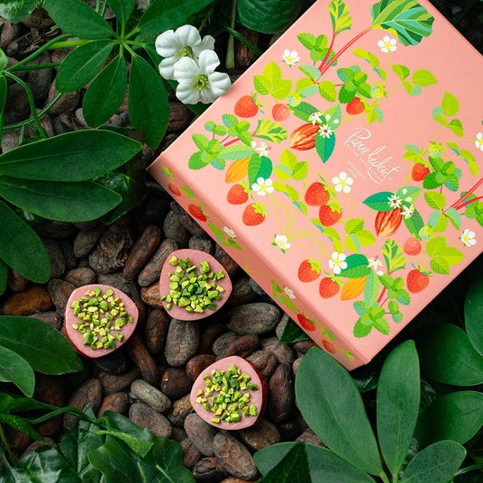 優しい甘さのストロベリーショコラのコーティングにピスタチオプラリネのコク深く濃厚な味わい。