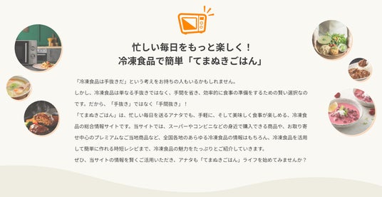 そこで、冷凍食品に対する誤解を解き、真の魅力を伝え、より多くの方に冷凍食品を生活に取り入れていただくため、情報サイト「てまぬきごはん」を開設いたしました。