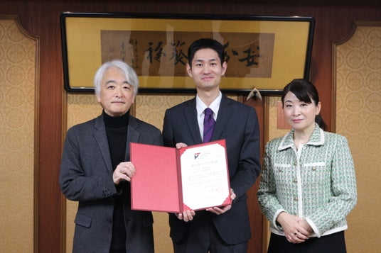 1月17日に国立キャンパスにて開催された称号授与式において、弊社代表の片岡が中野学長より称号をいただきました。