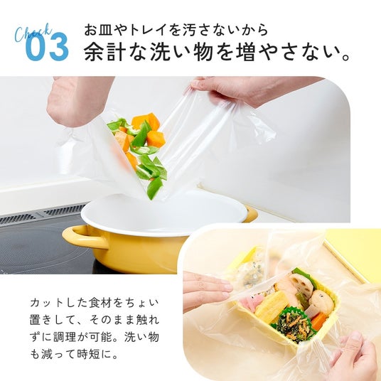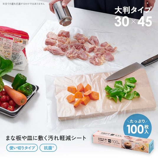 まな板やお皿の上に敷いて汚れを軽減するシート。食材が直接まな板に触れないので汚れや色移りを防ぎ、洗い物を減らして後片付けの時短に。作業台やテーブルに敷いて食材のちょい置きや、下味つけなど調理スペースの確保にも便利です。抗菌タイプ。