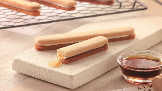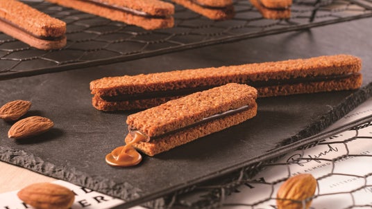 自家挽きのアーモンドをたっぷりと使ったザクザク食感のクロッカン生地やサブレで、とろとろっとした食感のキャラメル入りショコラをサンドしました。クロッカン生地に使用しているアーモンドは、クロッカン生地専用にミリ単位で挽き方を調整しており、アーモンドの香ばしい風味とザクザク食感を存分に感じることのできるこだわりレシピでつくっております。食べやすく、満足感のあるスティックタイプの形状もご好評いただいているポイントです。ぜひ感動のアーモンド体験を味わってみてください。
