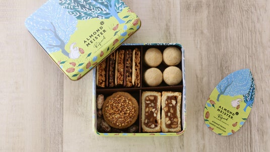 5種類のアーモンドクッキーと味付きアーモンドを詰め合わせた、アーモンド尽くしのクッキー缶です。アーモンドの森をイメージしたオリジナル缶のデザインも目を引く魅力ポイントです。