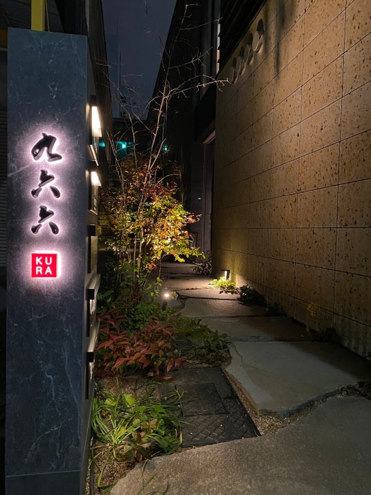 ライトアップされた九六六蔵エントランス