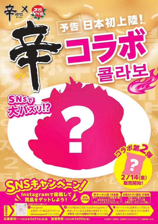 ◆応募方法:太陽のトマト麺公式Instagram(@taitomajapan)をフォローし、「辛ラーメン×トマト麺」コラボメニュー第1 弾・第2 弾いずれかの写真にハッシュタグ「#辛ラーメン×太陽のトマト麺」を付けて投稿。