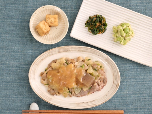 副菜は、柔らかい絹揚げのごまあえ、香り豊かなほうれん草の生姜醤油、マヨネーズで仕上げたコクのある枝豆ポテトです。