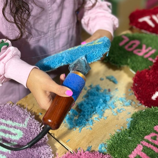 タフティングガンで一針一針毛糸を打ちこんでいく「タフティング(Tufting)」という技法で制作をしています。毛糸を密に打ちこんでいるので、ふかふかな手触りで厚みがあります。裏面はメッシュ加工で、滑り止め効果も。