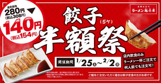 京都北白川ラーメン魁力屋をチェーン展開する株式会社魁力屋(https://corp.kairikiya.co.jp/本社:京都市中京区、代表取締役社長:藤田 宗、以下魁力屋)は、「餃子半額祭」を2025年1月25日(土)~2月2日(日)の期間で開催いたします。