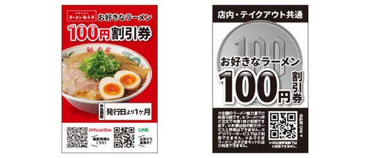 ラーメン(並)または(大)1杯をご注文いただいたお客様に、レジにて「お好きなラーメン100円割引券」1枚をお渡しいたします。