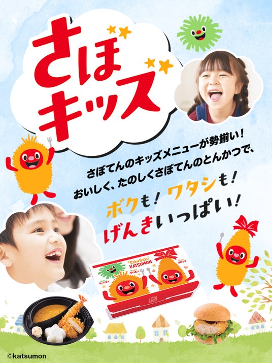 さぼてんの公式キャラクター「サクサクかつモン」デザインの「さぼキッズBOX」のほか、お子さまから大人の方まで楽しんでいただけるさぼてん王道商品を使用したメニューを取り揃えています。「さぼキッズバーガーキット」「さぼてんファミリーBOX」は、土日祝日のみ数量限定で販売し、土日祝日限定メニューをお買い上げいただいたお客様には、「かつモングッズ」をプレゼントいたします。