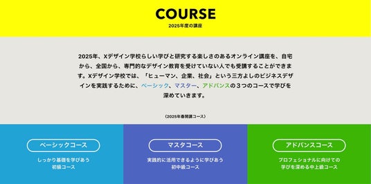 2025年のXデザイン学校は進化します。「ヒューマン、企業、社会」という三方よしのビジネスデザインを実践するために、「ベーシックコース」ではしっかり基礎を学び、「マスターコース」ではより実践的に活用できるように、「アドバンスコース」では、プロフェショナルに向けての学びを深めていきます。コース名は昨年と同じですが、大きな変化を考慮して内容をアップデートします。
