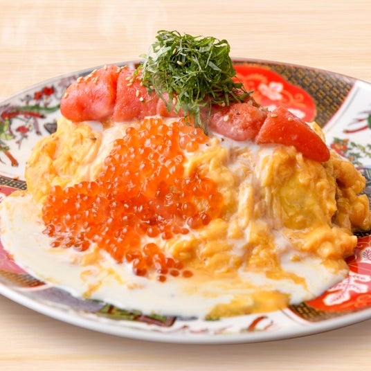 ドーンと1本まるごと”明太子”に視線は釘付け!プチッと弾ける食感のいくらと風味豊かな大葉をたっぷりトッピングし、見た目も華やかな和風オムライスに仕上げました。ふわっふわ半熟卵のまろやかさと明太子のピリリとした辛さが病みつきなる美味しさです。