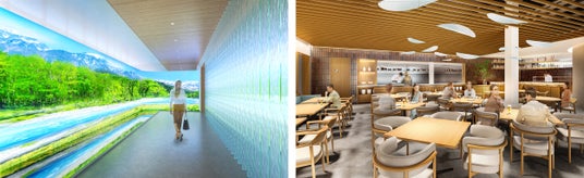 大阪・関西万博で水と空気の水上スペクタクルショーを共同で出展するダイキン工業と共創するレストランです。店内は清冽な水の流れや緑あふれる景色と清々しい空気を再現し、万博会場のウォーターフロントにいながら、まるで高原のレストランで食事をしているような体験をしていただけます。ダイキン工業の先端技術により温度や湿度、気流を最適にし、清涼で爽やかな空気を店舗内につくり出します。再生農業※2原料を使用した当社初のビール「水空エール」や、ウイスキー、ワインなどの酒類を当店オリジナルにアレンジしたドリンク、国内産の食材を活用したコース料理をご提供します。また、店内のテーブルには、長年ウイスキーを育み、その役目を終えた樽材からつくられた家具「サントリー樽ものがたり※3」を採用し、熟成にかかる時の流れを感じながらゆったりとお食事をお楽しみいただけます。