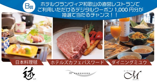 B賞 ホテルグランヴィア和歌山レストランでご利用いただけるデジタルクーポン1,000円分が抽選で当たるチャンス!
