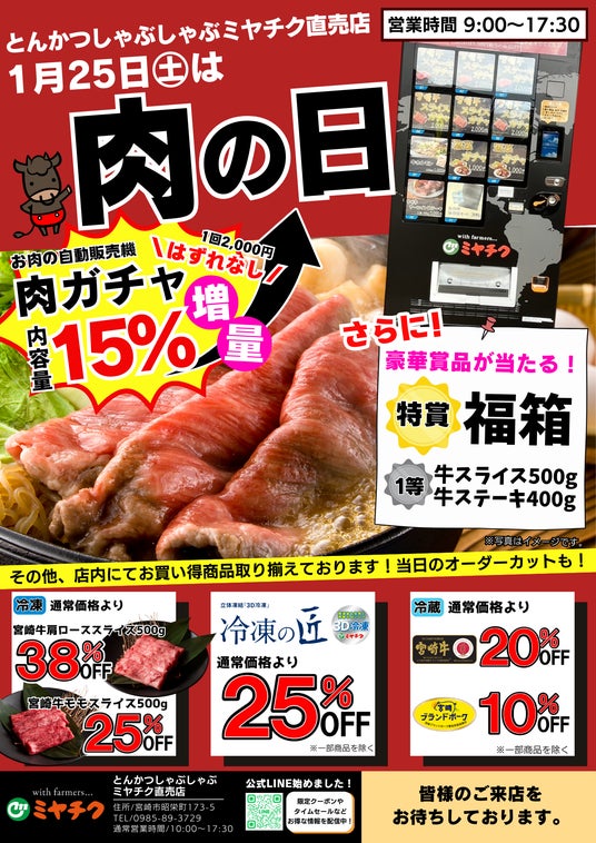 株式会社ミヤチク(本社:宮崎県都城市/代表取締役社長:船ヶ山 祐二)が運営する「宮崎牛」「宮崎ブランドポーク」「ハム・ソーセージ」を取り扱う直売店(宮崎県内3店舗)にて、1/25(土)にお肉が割引価格でお買い求めいただける「肉の日」を開催します。