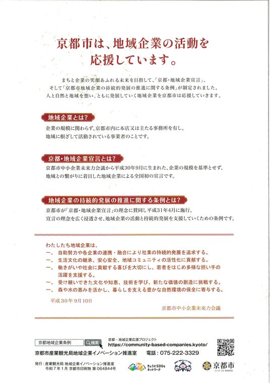 京都市地域企業の持続的発展の推進に関する条例が制定され、人と自然と地域を想い、ともに発展していく地域企業を京都市が応援するプロジェクト。