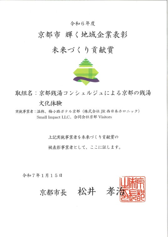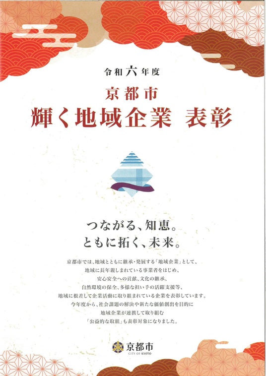 京都市では、「京都市 輝く地域企業表彰」制度を設け、地域と共に継承・発展する「地域企業」の理念の浸透及び実践の促進を図っており、その中で、新たな価値の創出等を目的に地域企業等が連携して実施した取組のうち、他の事業者のモデルとなると認められる13取組を「未来づくり貢献賞」として表彰。社会課題の解決や新たな価値の創出等を目的に地域企業等が連携して実施した事業のうち、独自性、社会性、発展性等について、他の事業者のモデルになる取組として認められ、受賞にいたりました。