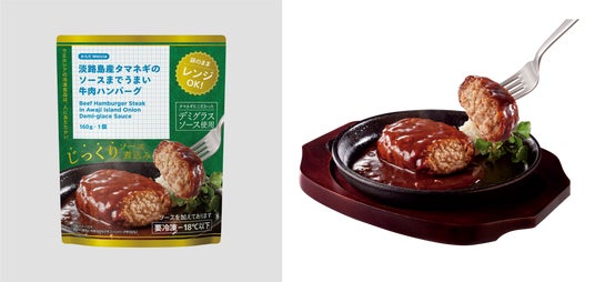 この人気を受け、第3弾として牛肉を使用した「淡路島産タマネギのソースまでうまい牛肉ハンバーグ」を開発しました。2年の開発期間を経て完成した本商品は、市場にはあまりない牛肉を100%使用※2したハンバーグです。淡路島産玉ねぎの甘みが牛肉の旨みをさらに引き立てます。電子レンジで簡単に調理でき、忙しい方でも本格的な味わいが楽しめます。