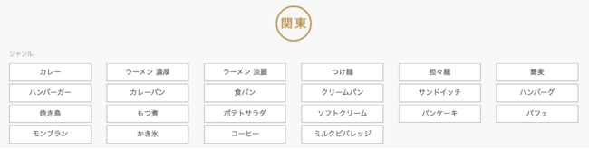 カレー、ラーメン 濃厚、ラーメン 淡麗、つけ麺、担々麺、うどん、蕎麦、ハンバーガー、食パン、カレーパン、クリームパン、サンドイッチ、ハンバーグ、焼き鳥、もつ煮、ポテトサラダ、ソフトクリーム、パンケーキ、パフェ、モンブラン、かき氷、コーヒー、ミルクビバレッジ