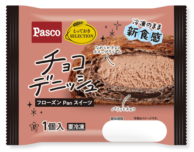 チョコクリームを折り込んだデニッシュに、チョコとチョコホイップクリームを包みました。冷凍のまま食べると、中に包んだチョコはパリッと、チョコホイップクリームはアイスのような食感です。