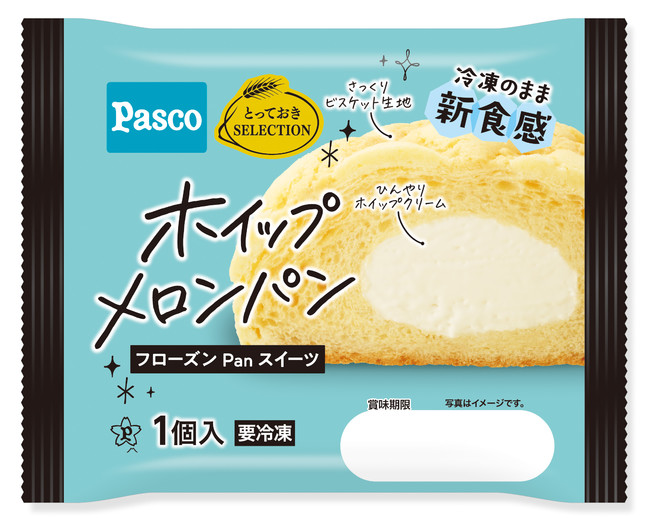 さっくりとしたビスケット生地をかぶせた、ミルクホイップクリーム入りの冷凍のままひんやりとした食感を楽しめるメロンパンです。