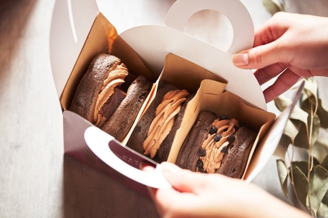 "しっとり、もっちり"としたショコラ生地とパンケーキに挟まれた特製のショコラクリームがベストマッ。