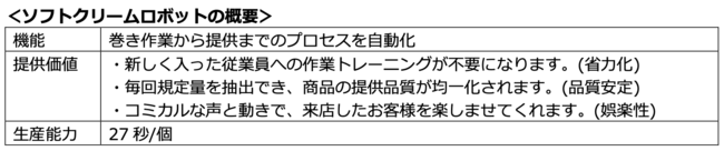 同ロボットは長崎ハウステンボスやポッポ イトーヨーカドー幕張店をはじめ、現在10店舗以上で稼働実績のあるロボットです。一定期間の習熟が必要とされるソフトクリームの巻き作業を自動化することで、ボタン一つで品質の安定した商品を提供できます。
