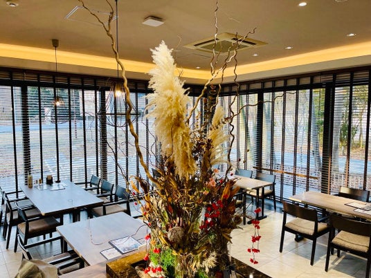 広々とした屋外空間は現代アートも展示されフリースペースになっている。2月1日からはガイアリゾート宿泊施設の夜間チェックインも同店で行う予定(17:00~20:00)