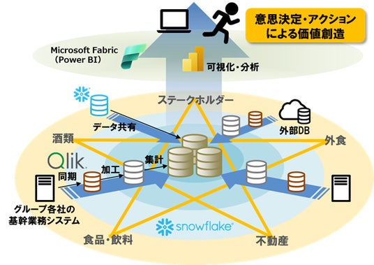 今後はこのデータ基盤システムを軸に、ステークホルダーに関わるデータや、酒類事業や食品・飲料事業の出荷データ、飲食店事業の飲食動態データに加えて、気象情報などのオープンデータに対して社員が容易かつ安全にアクセスできる仕組みの構築やデータベースの拡大を推進し、社会環境の変化に柔軟に対応するための環境を整備します。各社・各部門における意思決定の迅速化・高度化を促進することによる価値創造や、様々なビジネス課題の解決に貢献します。