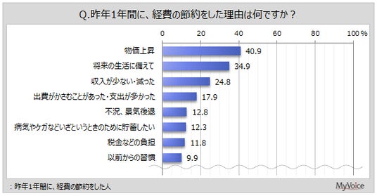 昨年1年間に経費を節約した人の節約した理由は(複数回答)、「物価上昇」が40.9%、「将来の生活に備えて」が34.9%、「収入が少ない・減った」が24.8%です。