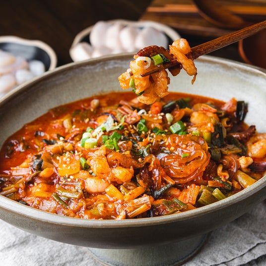 낙곱새(ナッコプセ)は낙지(ナクチ)タコ/곱창(コプチャン)ホルモン/새우(セウ)エビの頭文字を取ったことが由来の、韓国釜山発祥の郷土料理です。浅めの鍋に3種の具材と野菜を加えて、ピリ辛タレと一緒に炒めて煮込んだもので、ご飯を入れても良し、お酒との相性も抜群な人気料理です。「孤独のグルメ」や「相席食堂」で取り上げられて以来、急激に認知度が高まったことで、日本の韓国料理店もこぞって導入し始めました。