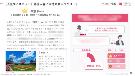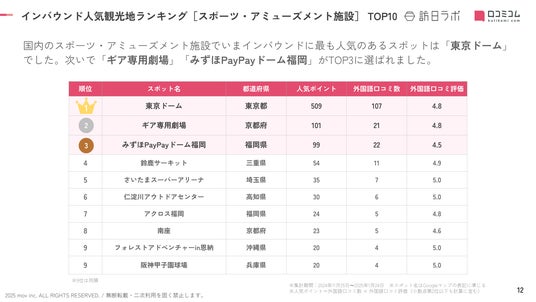 業界最大級のインバウンドビジネスメディア「訪日ラボ」及び 店舗向け集客一元化プラットフォーム「口コミコム」を運営する株式会社mov(代表取締役:渡邊 誠、本社:東京都渋谷区、以下mov)は、国内のスポーツ・アミューズメント施設に寄せられた最新の口コミデータから、独自の『インバウンド人気観光地ランキング』を発表しました。