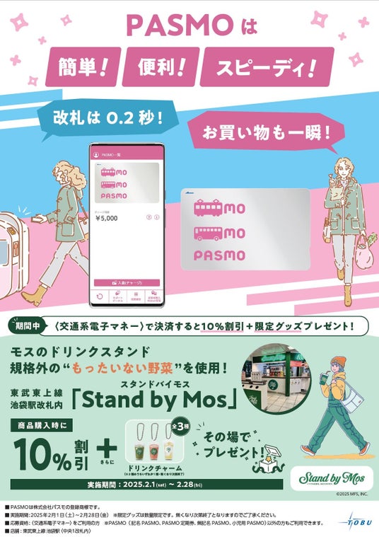 モスバーガーを展開する株式会社モスフードサービス(代表取締役社長:中村 栄輔、本社:東京都品川区)は、昨夏、規格外品や廃棄されてしまう野菜を主に使用したドリンクを販売する新業態のドリンクスタンド「Stand by Mos」(スタンドバイモス)を、東武東上線「池袋駅」の改札内にオープンしました。今回、この「Stand by Mos」で、東武鉄道株式会社と協力し、交通系電子マネーPASMOとのコラボキャンペーンを、2025年2月の1か月間に渡って実施します。