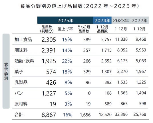2025年通年の値上げは累計で8867品目となり、年間の平均値上げ率は16%に達した。24年1月31日時点で判明した年間値上げ予定品目数合計(4556品目)に比べ、9割超の増加ペースで推移しており、25年は春先にかけて前年を上回る大規模な値上げラッシュが発生する見通し。コメのほか、チョコレートの原料となるカカオ豆、コーヒー豆などの高騰も背景に関連する製品で値上げが続き、25年3月は24年10月以来5カ月ぶりに単月で2千品目を超えるほか、4月は23年10月以来1年6カ月ぶりに3千品目を突破し、今後さらに増加するとみられる。