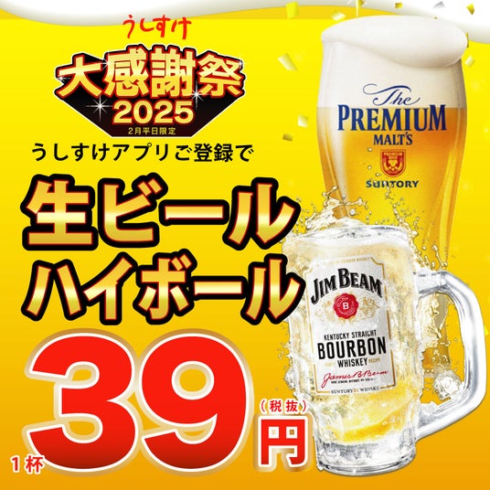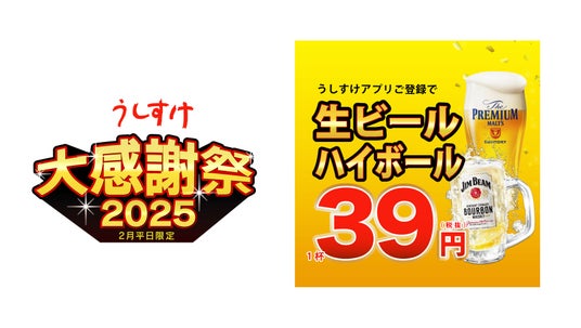 このたびのキャンペーンは、当社公式アプリ「うしすけアプリ」の登録者数10,000名に達したことを記念して、登録いただいているご利用者全員に、うしすけグループ全店舗で、生ビール(プレミアムモルツ)とハイボール(ジムビームハイボール)を感謝価格39円(税抜)でお楽しみいただけます。本キャンペーンは、登録済みの利用者だけでなく、期間内に新規登録される利用者も対象となります。期間内は、アプリ登録者の方は1杯39円で何杯でもお楽しみいただけるお得な企画となっております。