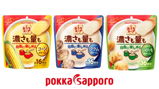 ポッカサッポロが展開するインスタントスープ。おうちスープ袋タイプはパウチ容器入りの大容量タイプで、いつもの飲み方はもちろん、たっぷり約16杯分の粉量(※)を、好きな量、好きな濃さでも自分好みに楽しむことができます。お客様からは「家族それぞれで、飲みたい量や好みの濃さが違うので便利」「その時の気分、時間帯によって量や濃さを変えられるのがうれしい」などのお声をいただいています。また具材が入っておらず、料理にも使える汎用性があり、パスタやドリアなど、手軽に様々なアレンジレシピもお楽しみいただけます。インスタントスープは個包装されている商品が多い中、紙箱や個包装をなくした環境にやさしい簡易包装です。チャック付き容器なので使い勝手がよく便利です。
