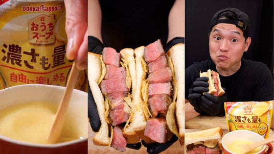 本プロモーションでは、「おうちスープ×ポテトチップス」という斬新な組み合わせを起点に、人気クリエイターのバヤシがオリジナルサンドイッチレシピを公開!肉厚ステーキと、「おうちスープ」の粉末で味付けしたポテトチップスを食パンでサンドするという斬新なレシピ動画になっています。香ばしく食欲をそそるアレンジレシピはSNS上で幅広い世代の注目を集めています。Nateeは企画考案・キャスティング・クリエイター制作動画のディレクションを担当しました。