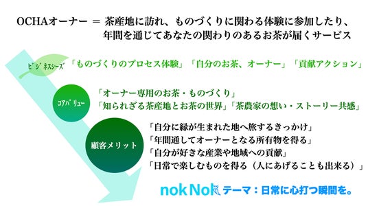 nokNok株式会社(東京都杉並区、代表:角野賢一、水野恵輔)は、「日常に心打つ瞬間を。」をテーマに2025年度も引き続きOCHA(日本茶)を中核的素材として選択し、事業拡大に挑戦いたします。 昨年度、静岡県静岡市の茶農家、茶問屋と協業し、クラウドファンディングの形で展開した「竜爪茶オーナープロジェクト」は合計123名の支援者様にご参加いただき、多くの方々から高い評価を受けることができました(アンケート回答 / 5段階評価で平均4.22)。