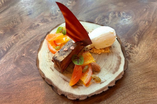 ビターチョコレートを使用した濃厚なテリーヌショコラに、薫り豊かな糸島産のシナモンを施しました。味の変化も楽しんでいただけるよう、バニラアイスを添えて提供。ヒマラヤ岩塩も効かせた、さまざまな味わいをお楽しみいただけるパティシエ特製の期間限定デザートです。