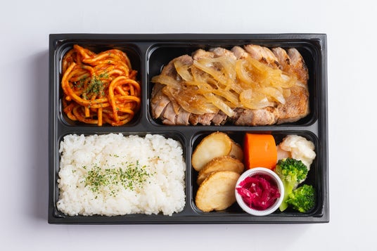 【ポークジンジャー弁当】しっかり厚みのあるロース肉をジンジャーソースで焼き上げ甘みを引き出したオニオンソテーをトッピング。