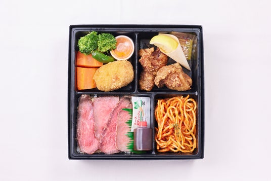【三笠会館弁当】唐揚げ、蟹クリームコロッケ、ナポリタン、ごはんにはローストビーフをのせて。長年にわたり多くのお客様から愛されてきた伝統の味を一折に。三笠会館の想いが込められたお弁当です。