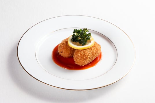 【蟹クリームコロッケ】丸ズワイガニの棒肉を丸ごと使用。三笠会館自慢のなめらかで濃厚なベシャメルソースがカニの旨みを引き立てます。レストランと同じ特製のトマトソースを付けてご用意いたします。高島屋新宿店では1個からお求めいただけます。