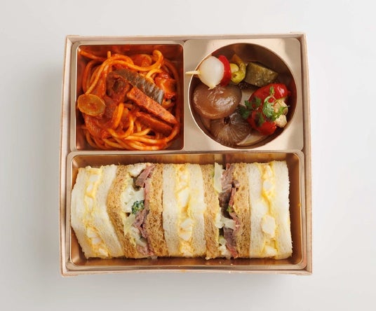 【サンドイッチ弁当】トリュフ風味の玉子サンドと初代料理長のレシピを受け継ぐローストビーフにカリフラワー&ブロッコリーサラダをサンドしたの2色のサンドイッチにスパゲッティナポリタンや彩り野菜のピクルスが目にも楽しい三笠会館ならではのランチボックスです。