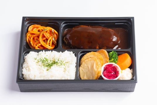 【ハンバーグ弁当】ごはんによく合う手間暇かけた艶やかなデミグラスソースをたっぷりかけたハンバーグ。脇役のスパゲッティナポリタンやポテト、人参のグラッセにも三笠会館の技が光ります。